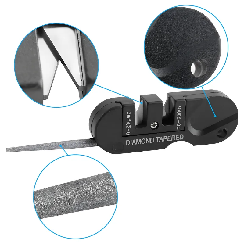 Schärfe, poliere und pflege sowohl glatte als auch gezahnte Klingen. Jeder Schlitz garantiert sichere, schnelle und effektive Ergebnisse.