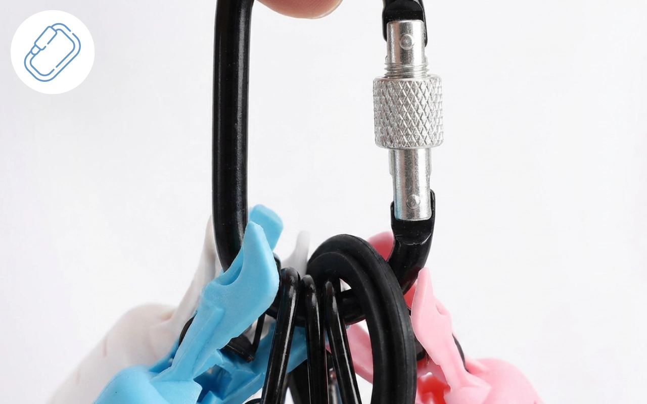 Verstauen Sie Ihr Angelzubehör ordentlich und halten Sie alles auf jeder Tour gut sortiert. Der Karabiner hält alles zusammen und spart Platz in Ihrer Ausrüstung.