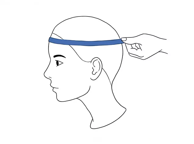 • 2. Legen Sie das Maßband um Ihren Kopf, knapp über Augenbrauen und Ohren und um die breiteste Stelle am Hinterkopf.