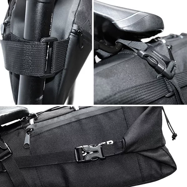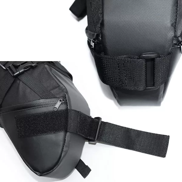 Das verbesserte Sattelbefestigungssystem zusammen mit den Kompressionsriemen verringert den Pendel-Effekt. So kann diese Fahrradtasche das Wippen reduzieren und eine bequeme Fahrt für lange Kilometer bieten. Außerdem verwendet diese Satteltasche eine bequeme Methode der Befestigung. Der Sattelstützengurt ist ein kräftiger Klettverschluss mit zwei oberen Riemen. Einer der Riemen wird um die Sattelstütze herum befestigt, und zwei der Riemen werden durch die Sattelschienen geführt. So lassen sich die letzten beiden leicht durch Ziehen am Ende festziehen.