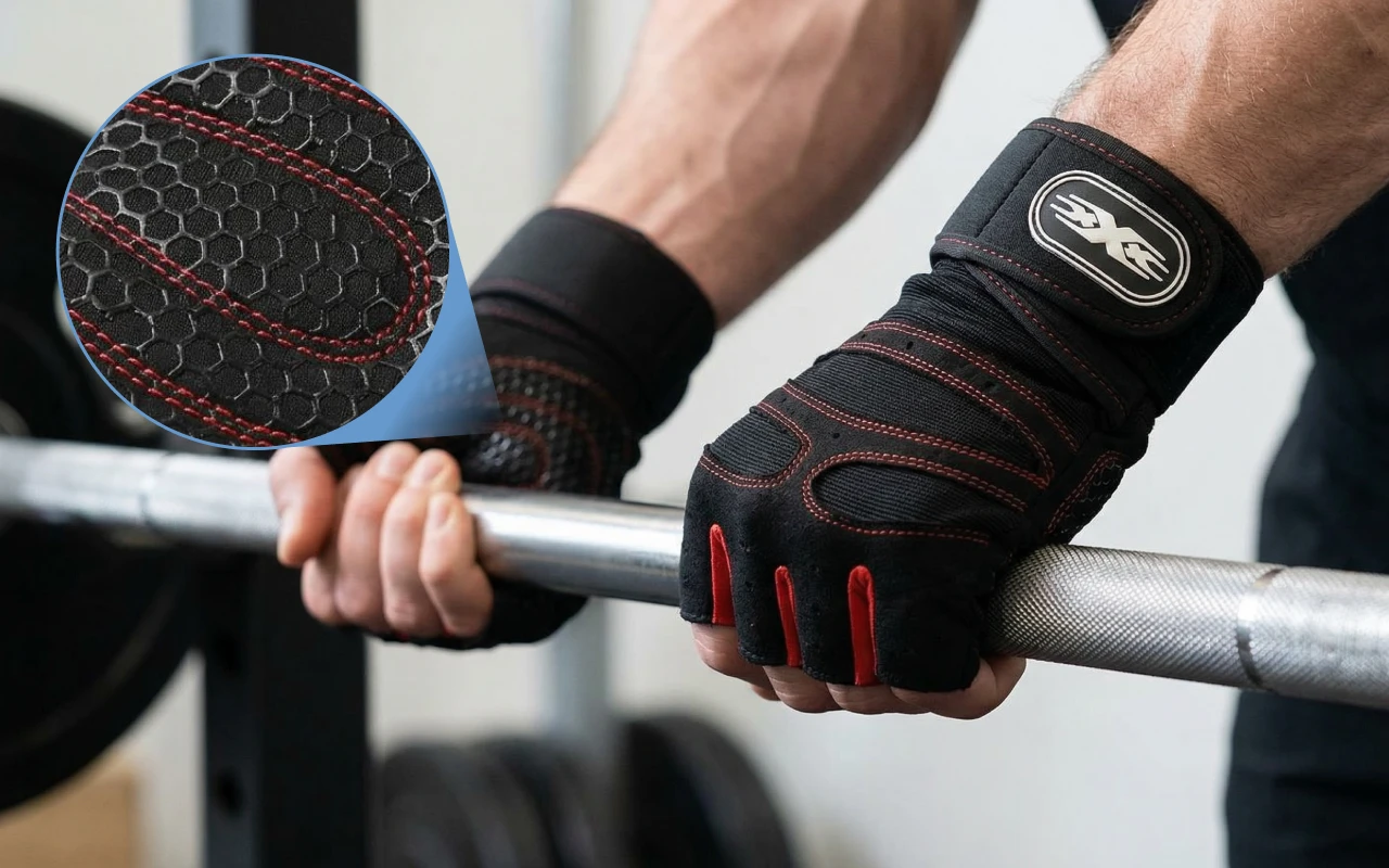 Handflächenpolster verhindern das Abrutschen für eine sicherere Nutzung von Hanteln oder Stangen. Rutschfeste Muster helfen, das Equipment sicher zu greifen.