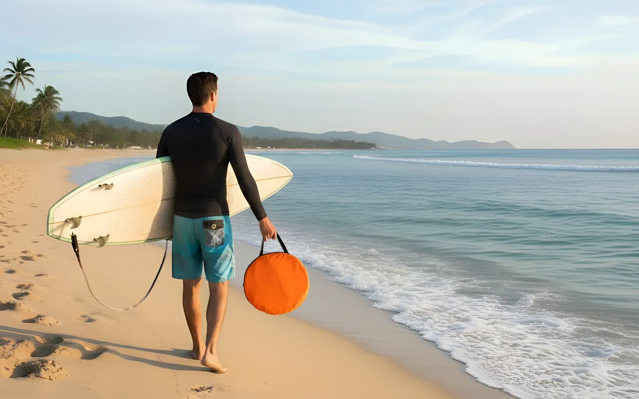 Das gefaltete Segel zu tragen ist super leicht. Ich liebe es, kein zusätzliches Gewicht zum Wasser schleppen zu müssen, es passt klein in meinen Rucksack.