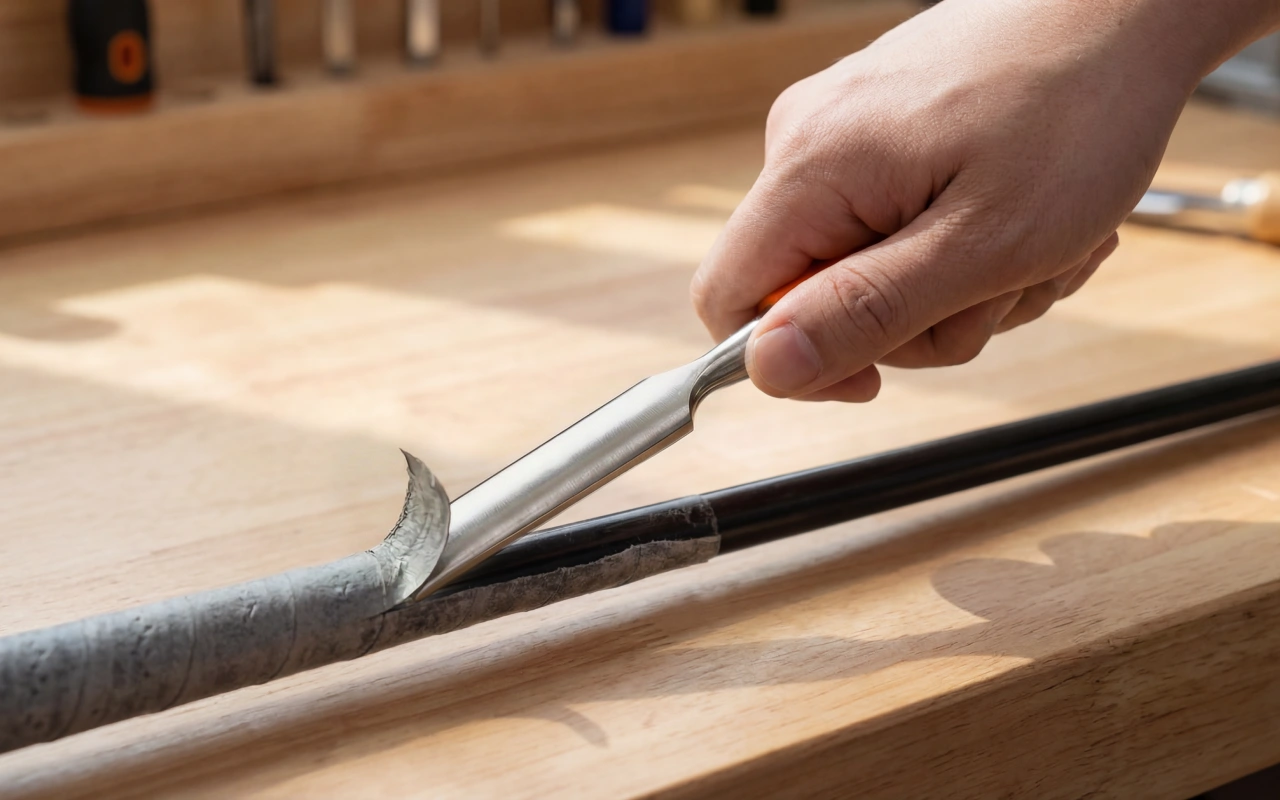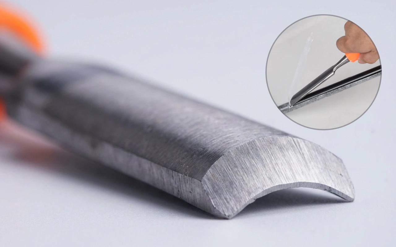 Die gebogene Form schmiegt sich an meine Stahlschäfte, sodass ich mir keine Sorgen um Kerben mache. Er fühlt sich ausbalanciert an, rutscht nicht und schneidet durch alten Kleber, als wäre es nichts.