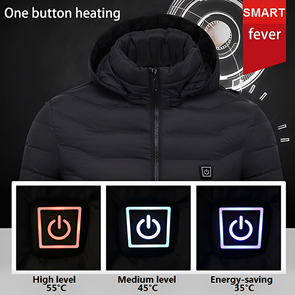 Unsere Heizjacken werden mit einer unterschiedlichen Anzahl von Heizkissen geliefert. Sie sind alle auf die Körperbereiche ausgerichtet, die am ehesten zum Frieren neigen. Je nach Vorliebe können Sie den Temperaturmodus (energiesparend, mittel und hoch) durch Drücken des Knopfes an der Brust einstellen. Sobald Sie den Knopf drücken, heizt sich die Jacke in Sekundenschnelle auf und steigt innerhalb einer Minute auf bis zu 30 °C.