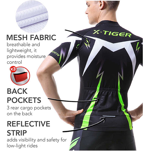 Der Stoff ist außerdem dehnbar und passt sich dem Körper beim Radfahren an, fast wie eine zweite Haut. Das Trikot bietet absolute Bewegungsfreiheit. Außerdem verfügt es über eine exzellente Schweißableitung. Auf der Rückseite des Trikots befinden sich drei Cargo-Taschen, in denen Sie Ihre Sachen leicht verstauen können. Es verfügt über eine reflektierende Lasche für zusätzliche Sicherheit bei Fahrten bei schlechten Lichtverhältnissen. Dieses Radtrikot hat außerdem einen durchgehenden Reißverschluss für einfaches An- und Ausziehen und Belüftung bei langen Fahrten. Mach dich bereit für ein neues Bike-Abenteuer!