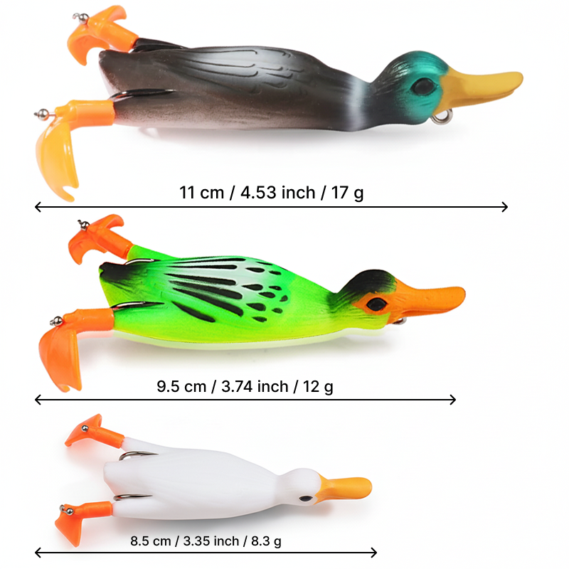 Threo Soft Duck Köder bewegen sich realistisch über die Wasseroberfläche. Jeder Wurf imitiert echte Beute und lockt sogar vorsichtige Räuber an. Flexibles Material hält scharfen Zähnen und starken Bissen stand. Fange mehr Hechte, Barsche oder Forellen in kürzerer Zeit.