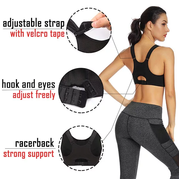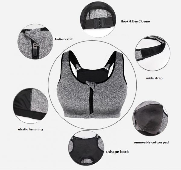 Der I-förmige Träger im Rücken schützt effektiv vor Stößen und verhindert, dass der BH verrutscht. Der BH hat einen Anti-Rutsch-Reißverschluss und Haken, die beim Sport vor dem Herunterrutschen schützen. Ein verstellbares Stützband im Rücken, wie bei einem Alltags-BH mit 3 Verschluss-Sets, ermöglicht die Einstellung der Körbchengröße.