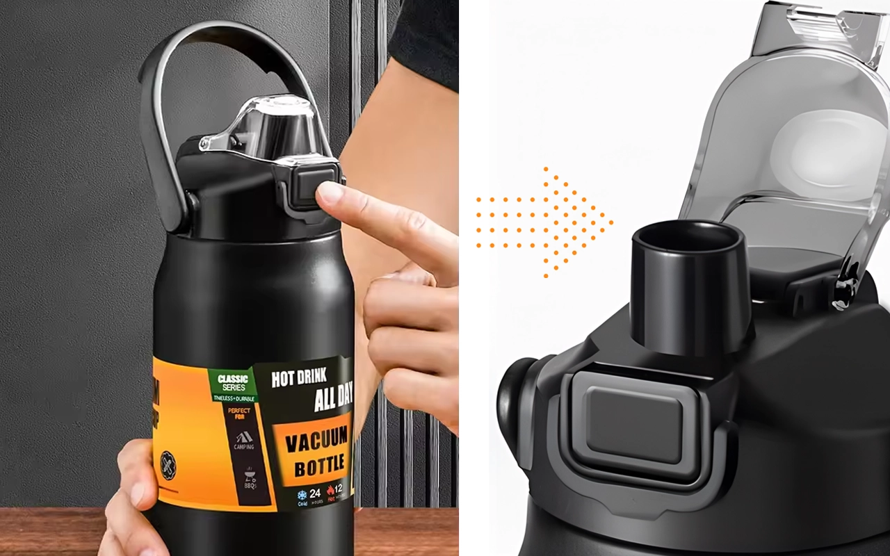 Mit nur einem Knopfdruck öffnet sich der Deckel für sofortiges Trinken. Auslaufsicherer Verschluss und Sicherheitsriegel verhindern Verschütten in deiner Tasche.