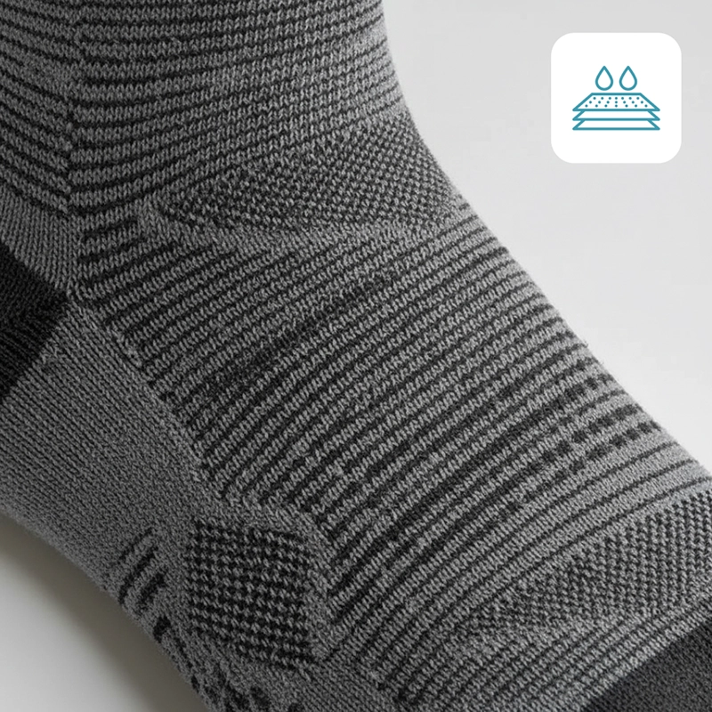 Coolmax-Garn transportiert Feuchtigkeit sehr schnell von der Haut weg. Die Feuchtigkeit verschwindet blitzschnell, sodass Sie sich nie klebrig fühlen.