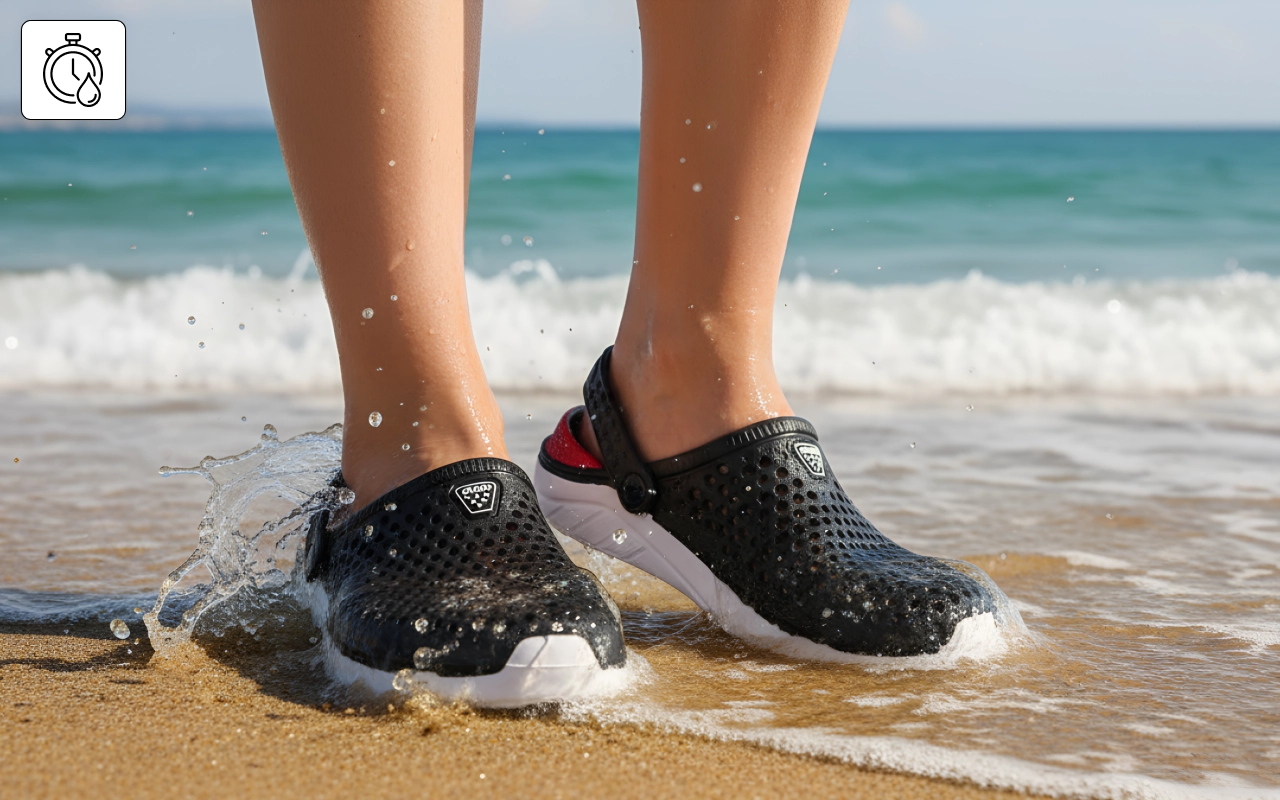 Wasser fließt frei durch, sodass die Füße länger frisch bleiben. Kein langes Warten mehr, bis nasse Schuhe wieder trocken sind.