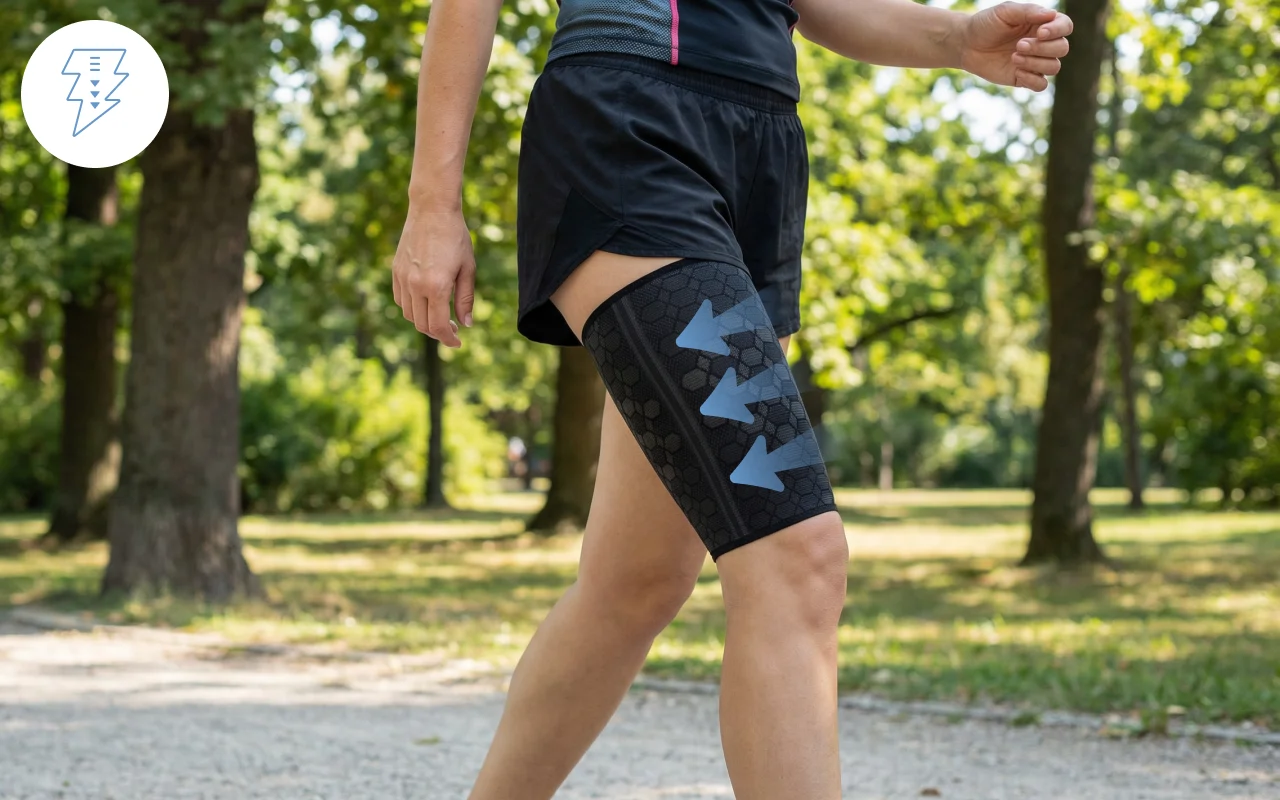 Beruhigen Sie schmerzende Muskeln schnell und verringern Sie Beschwerden bei Bewegung. Bleiben Sie aktiv mit stabiler Unterstützung für Ihren oberen Oberschenkel.