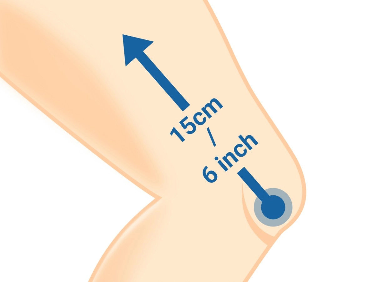 - 2. Legen Sie das Maßband um die breiteste Stelle Ihres Oberschenkels, etwa 15 cm/6" oberhalb der Mitte Ihrer Kniescheibe.