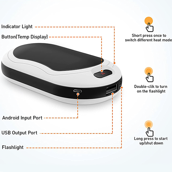 Unser Gerät ist leicht und kompakt, so dass es in die Taschen Ihrer Outdoor-Kleidung oder Handschuhe passt. Es gibt drei einstellbare Temperaturen (40 °C/50 °C/60 °C), die auf dem Display angezeigt werden können. Unser Handwärmer wird von beiden Seiten beheizt und erreicht die gewünschte Temperatur in wenigen Sekunden.
