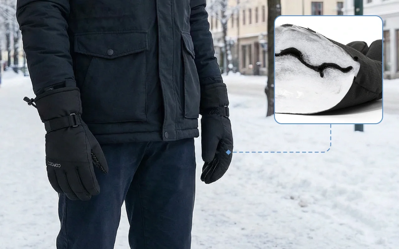 Regen oder Schnee dringen nicht durch die starke Außenhülle. Mehrere Schichten halten die Hände trocken und blockieren eisige Winde.