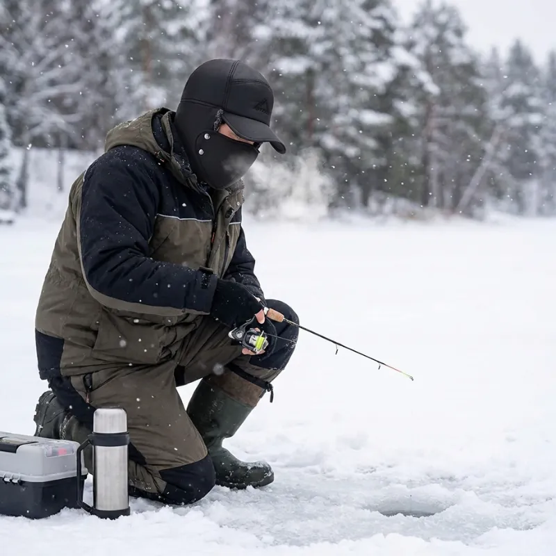 Ich benutze die Mütze beim Eisangeln. Die flauschigen Klappen blockieren die Brise vom See und die Maske verhindert, dass mein Gesicht brennt. Sitzt angenehm über meinen Ohren.