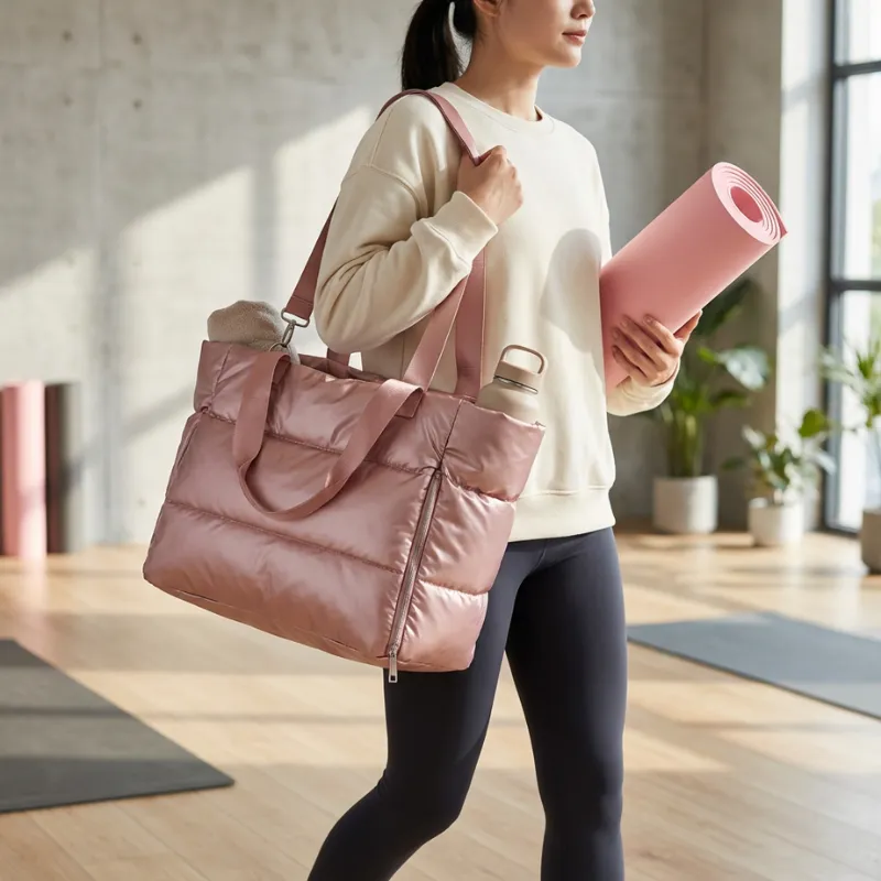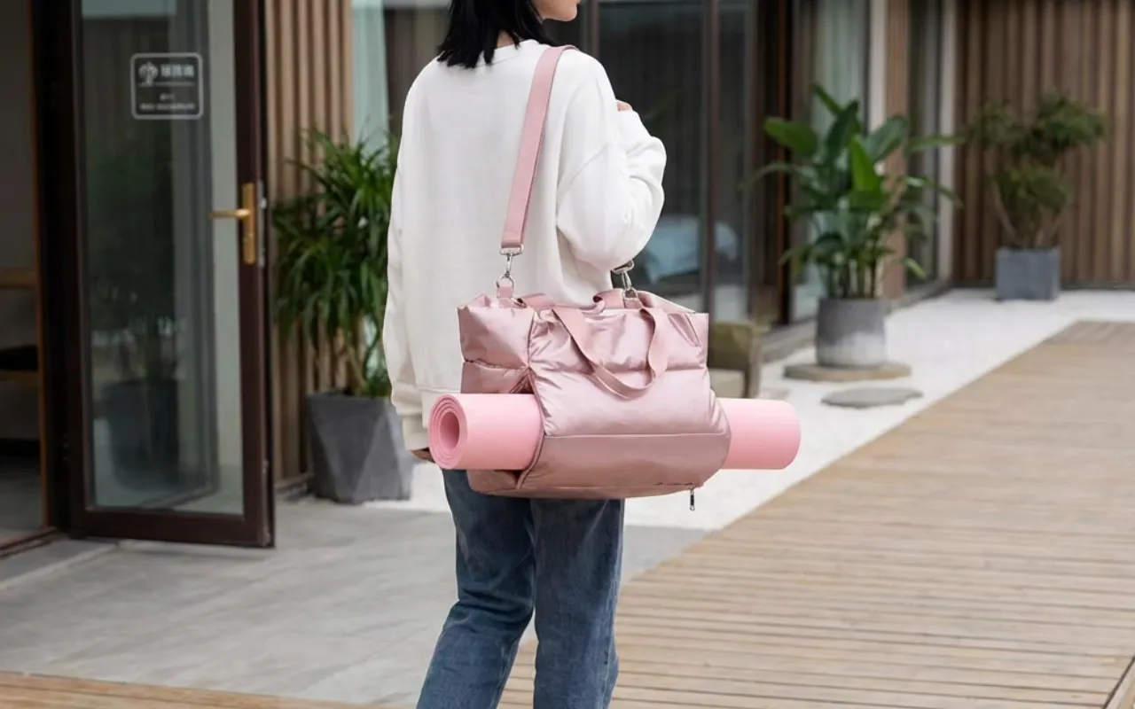 Die Tragetasche fasst alles für Yoga und Spinning, sogar mein großes Handtuch! Ich bin immer bereit, wohin ich auch gehe.